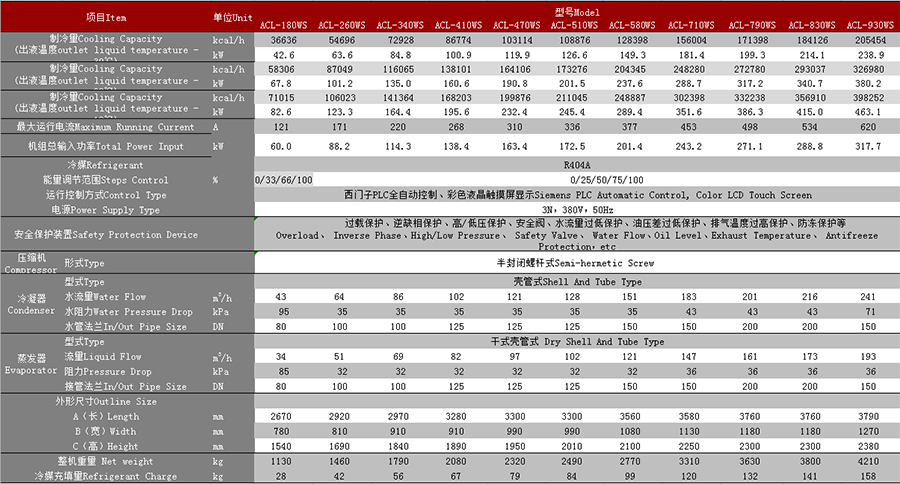 水(shuǐ)冷螺杆低溫冷水機(jī)組技術參數表(biǎo)(單壓縮機) :