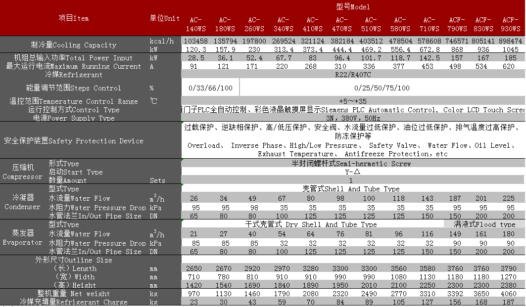 1.以上參數基(jī)於冷(lěng)凍水進/出水溫(wēn)度為(wéi)12℃/7℃,冷卻水進/出(chū)水溫(wēn)度為30℃/35℃。